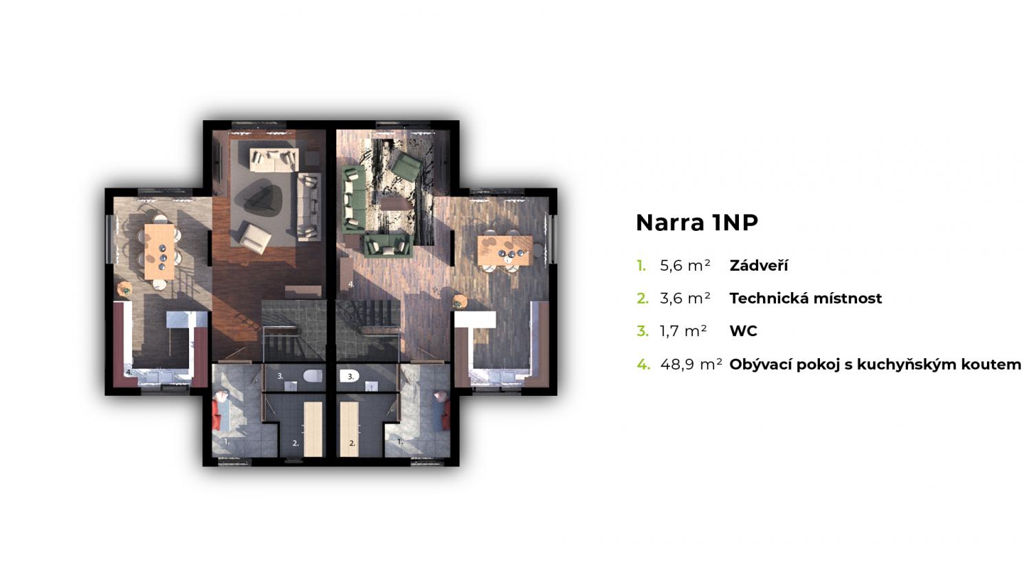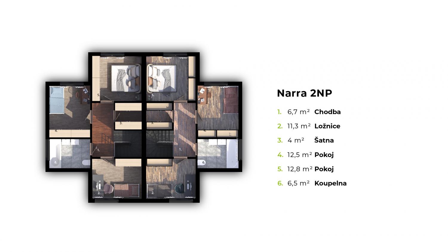 “Narra” může nabídnout v každém domě obývací pokoj s prakticky odděleným kuchyňským koutem, v patře pak ložnici, dva dětské pokoje a šatnu.