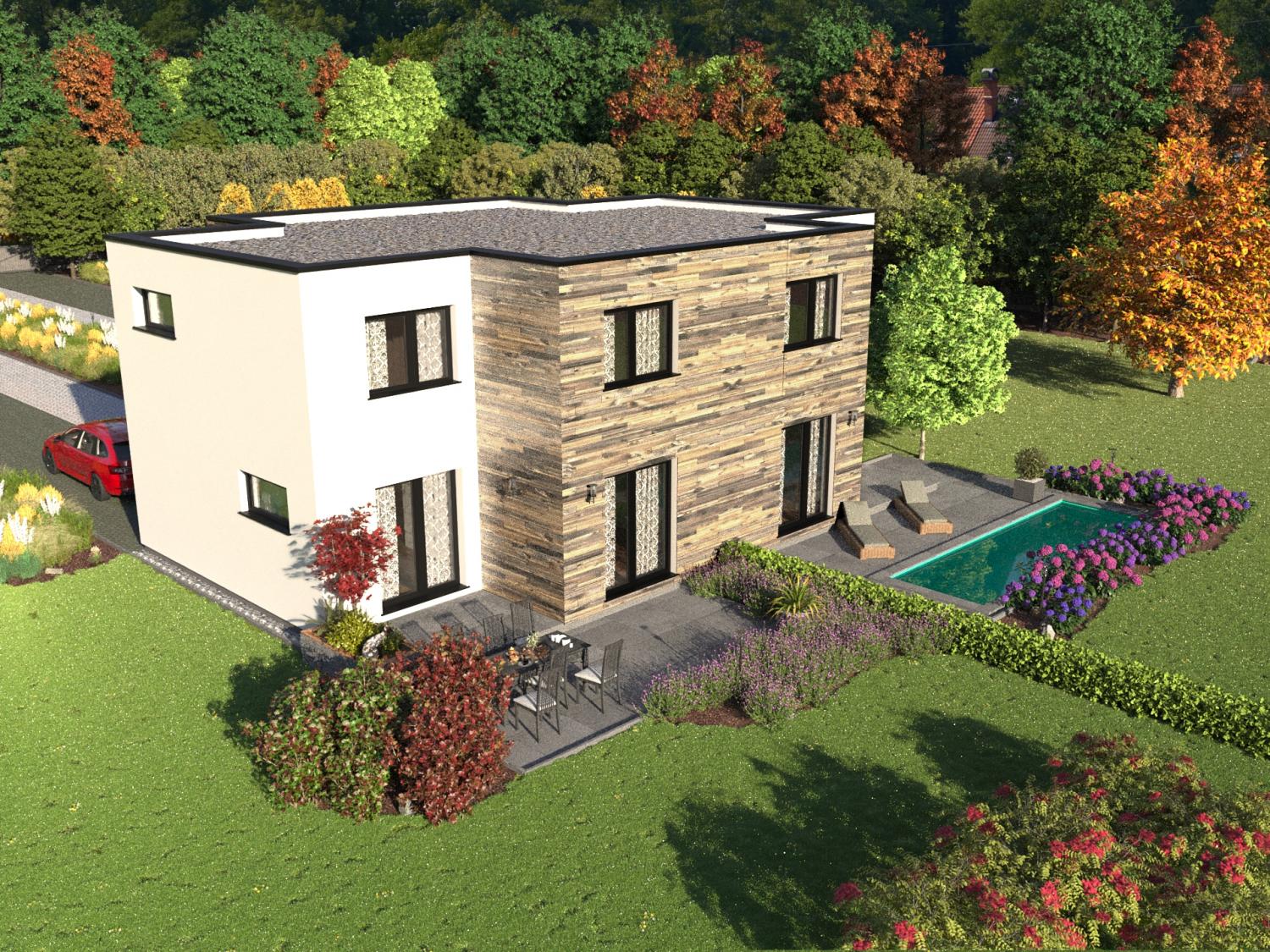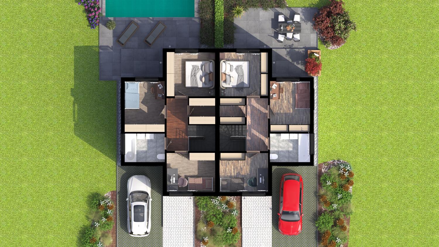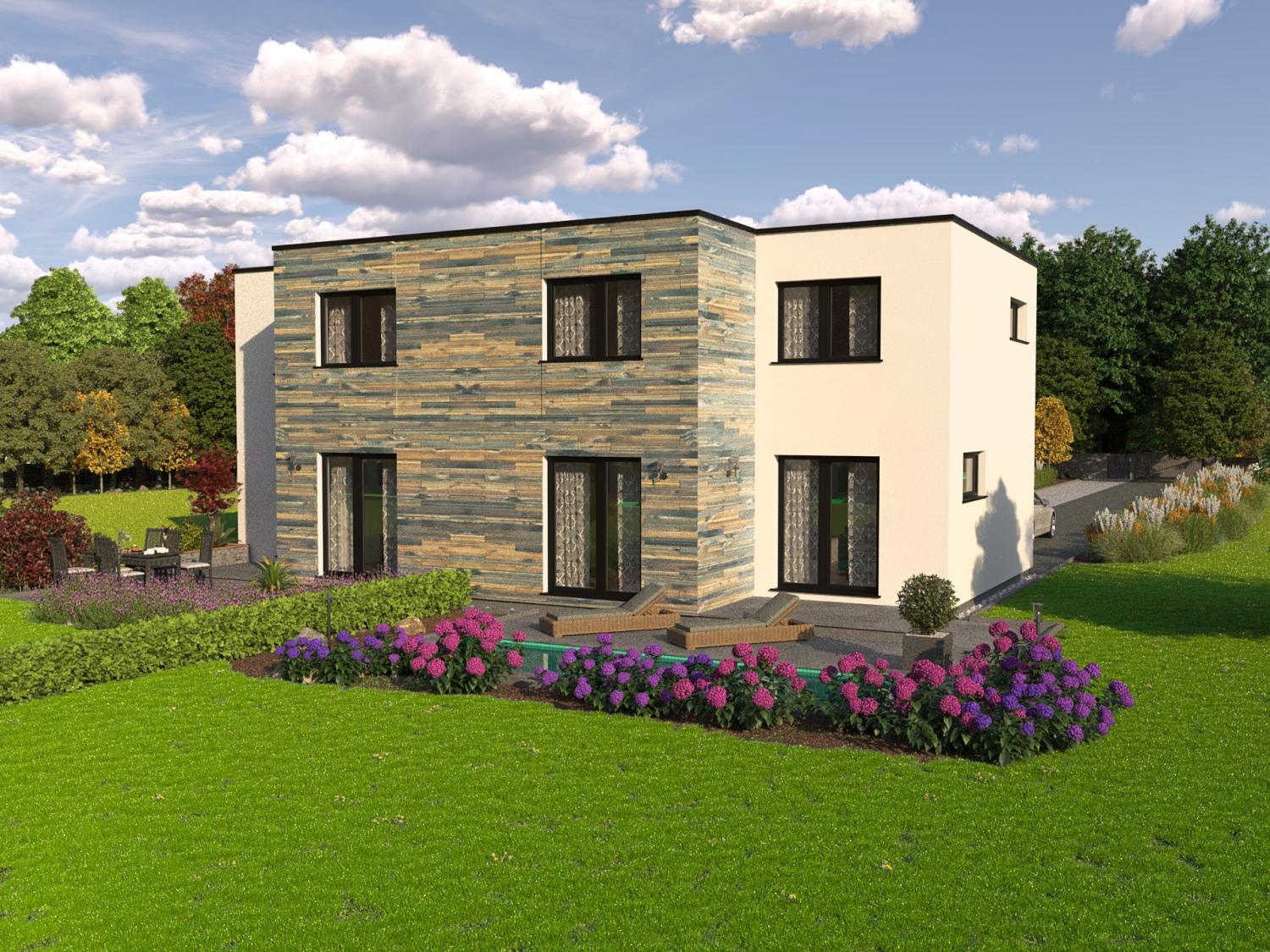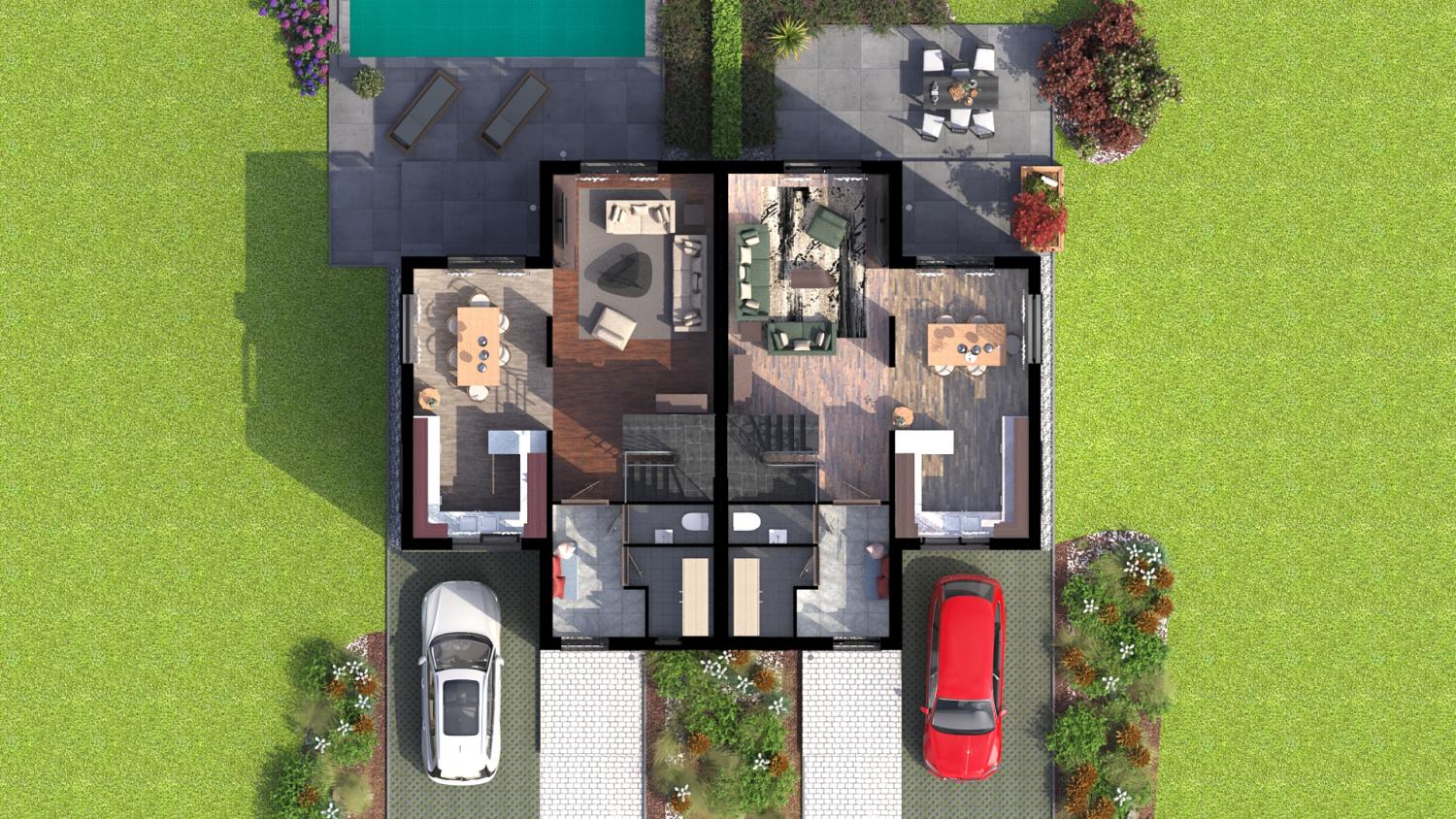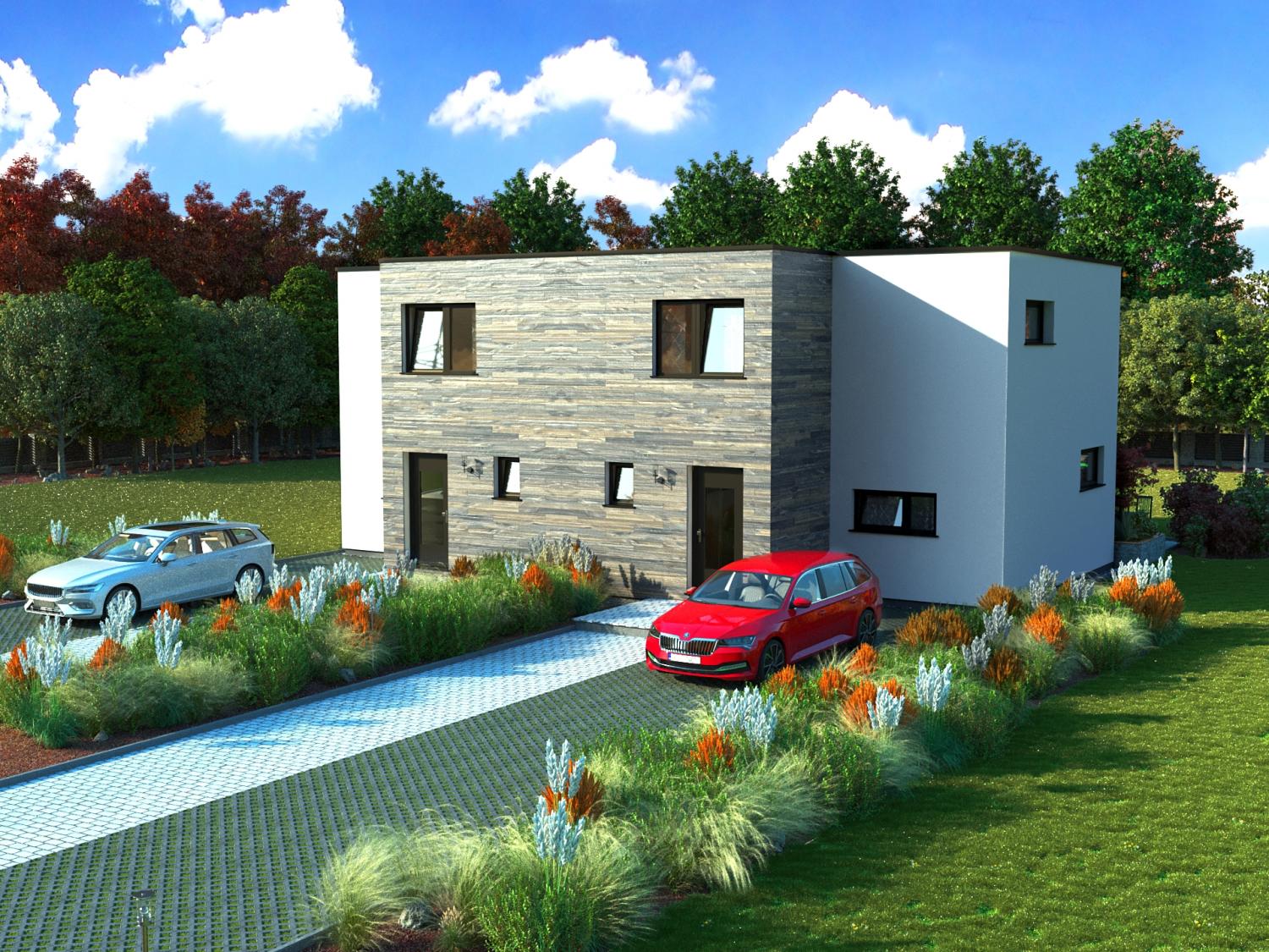 Moderní, typový, patrový rodinný dvojdům s plochou střechou, konstruovaný technologií montované dřevostavby.