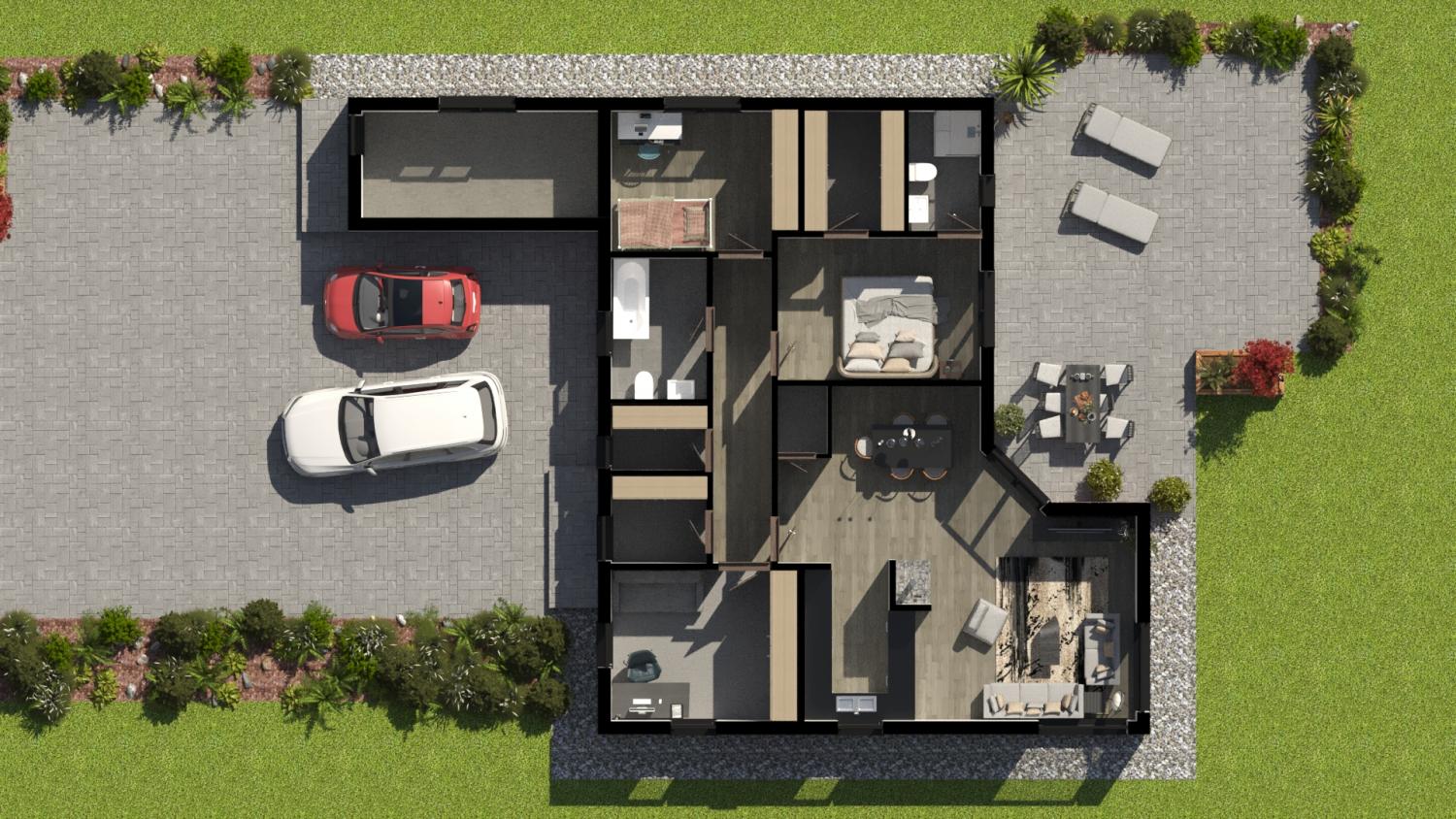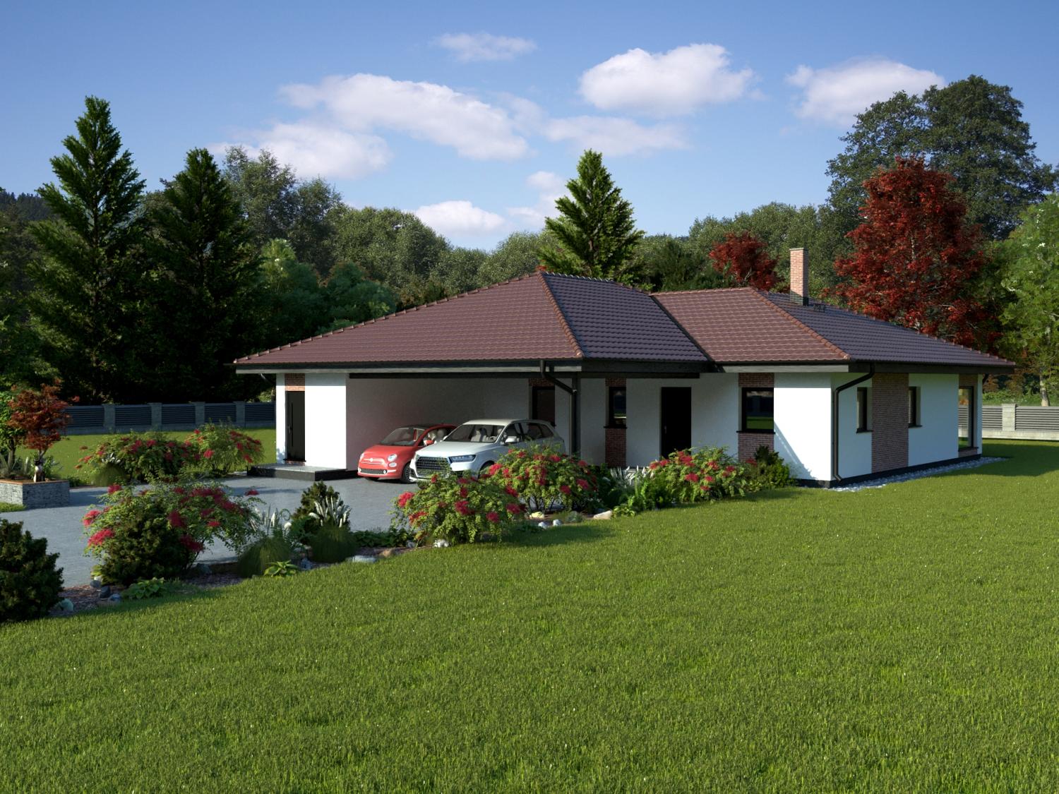 Součástí domu je zádveří, technická místnost a koupelna. Střecha domu vytváří kryté stání pro dva automobily.