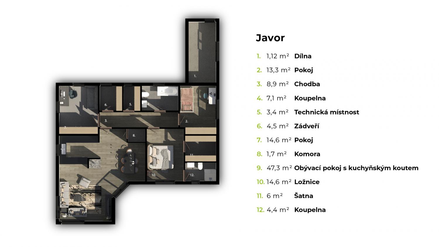 V “Javoru” najdete obývací pokoj s prakticky řešeným kuchyňským koutem a jídelnou, ložnici se šatnou i koupelnou a dva dětské pokoje.