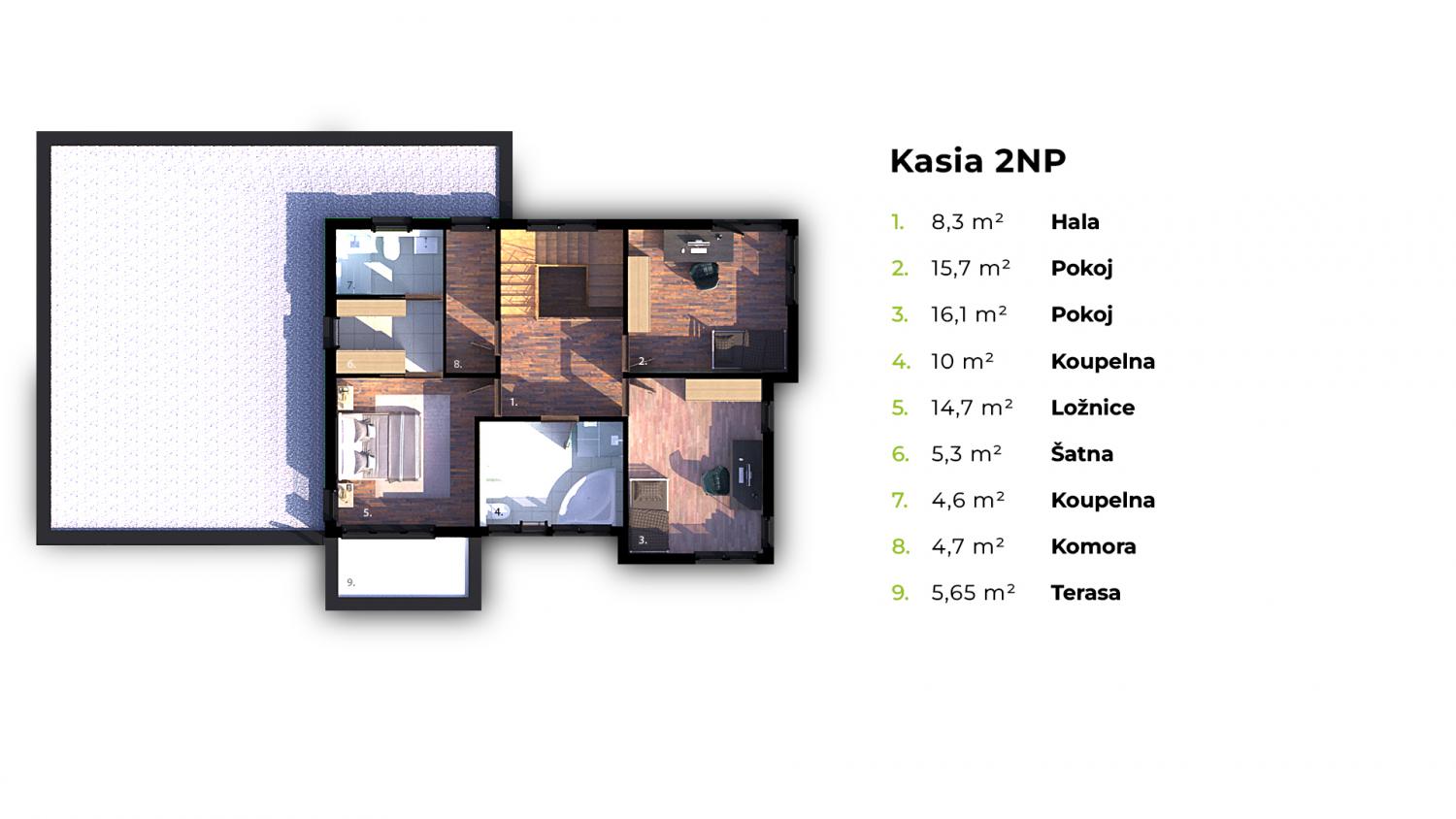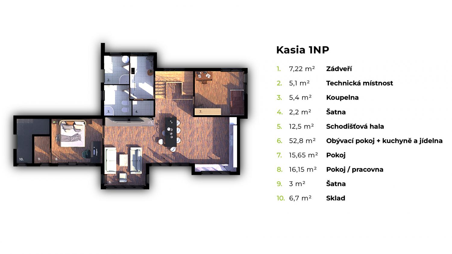 “Kasia” ve dvou patrech skrývá obývací pokoj s prakticky odděleným kuchyňským koutem a dva menší pokoje, v patře pak ložnici s vlastní šatnou i koupelnou a dva dětské pokoje.