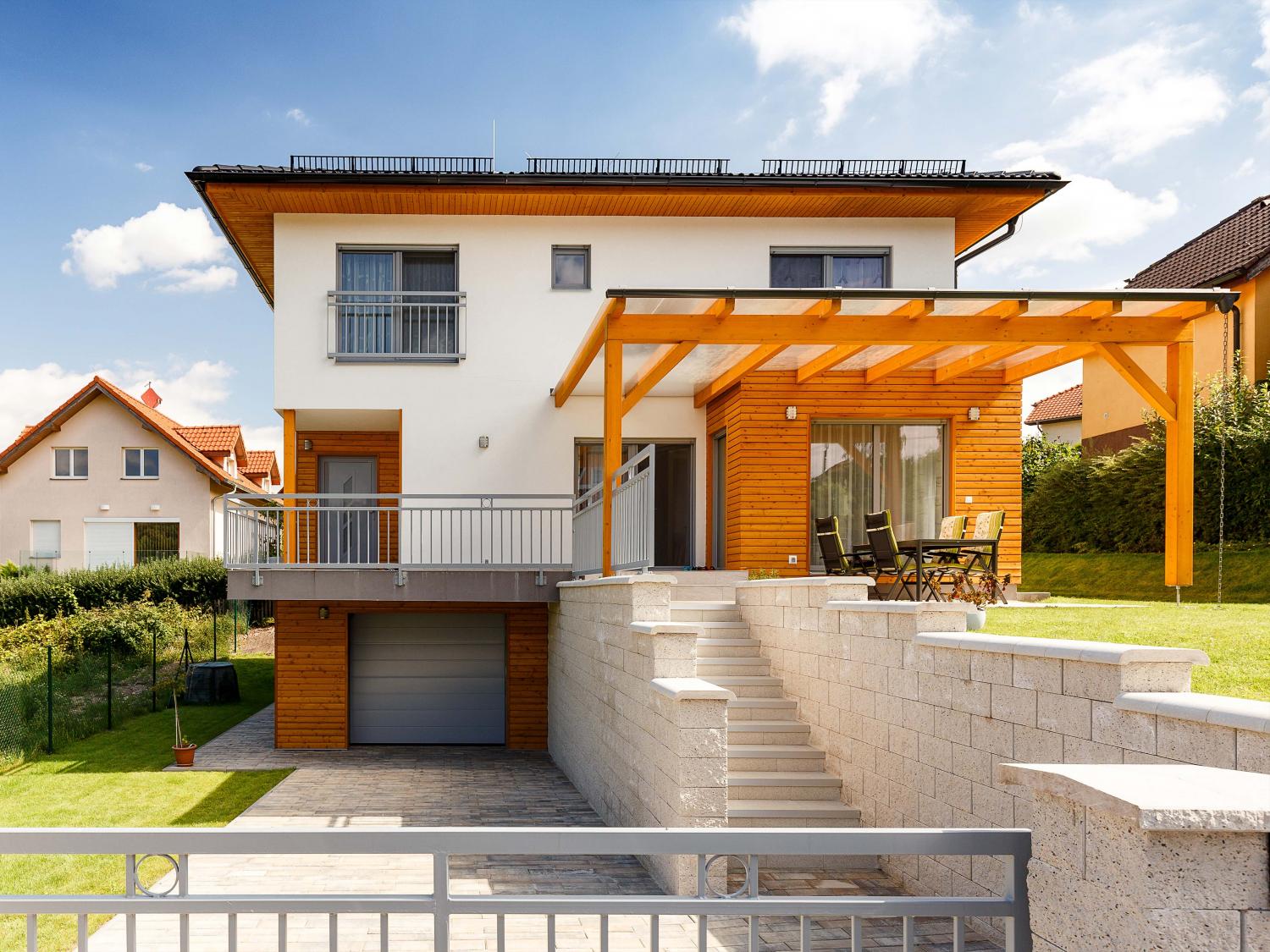 Dům jsme navrhli s částečným suterénem a opěrnou stěnu, nad kterou jsme vytvořili rovný pozemek se zahradou.