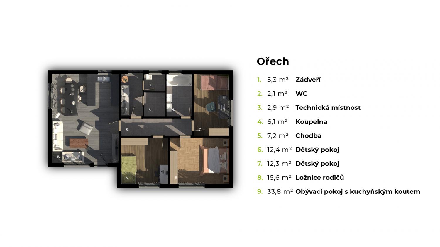 Do “Ořechu” jsme dostali obývací pokoj s prakticky řešeným kuchyňským koutem, ložnici a dva dětské pokoje.