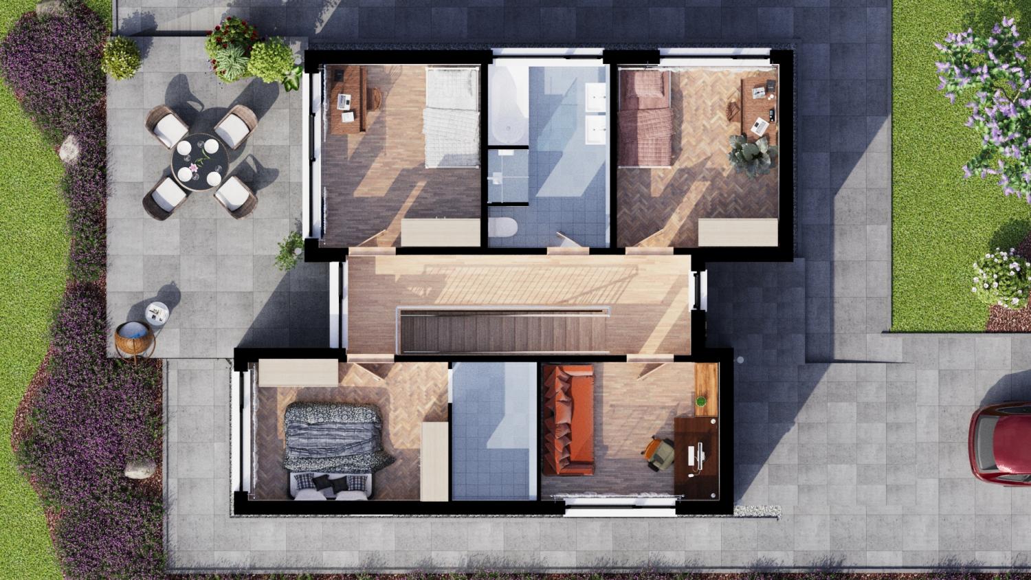 Dispozice projektu pamatuje i na volitelnou terasu a nebo stání pro druhý automobil.