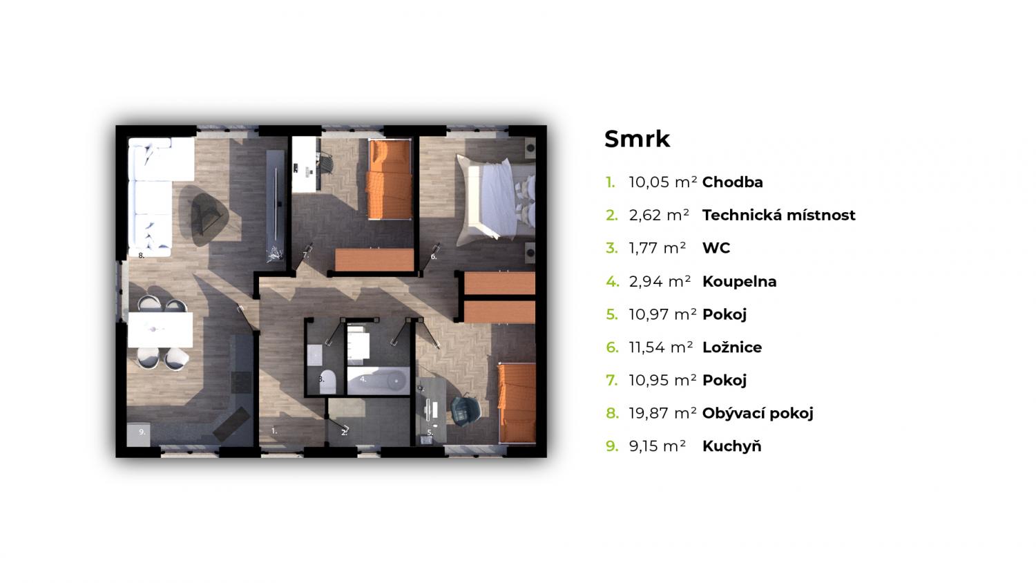 Takové bydlení vám nabídne obývací pokoj s prakticky odděleným kuchyňským koutem, ložnici a 2 dětské pokoje.