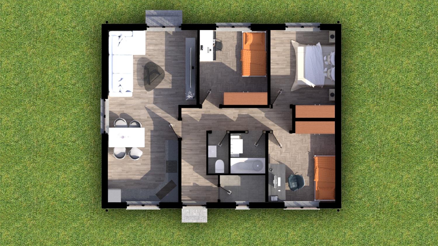 Akční, typový rodinný dům, konstruovaný technologií montované dřevostavby, je řešen jako samostatně stojící objekt, nepodsklepený, s jedním nadzemním podlažím.