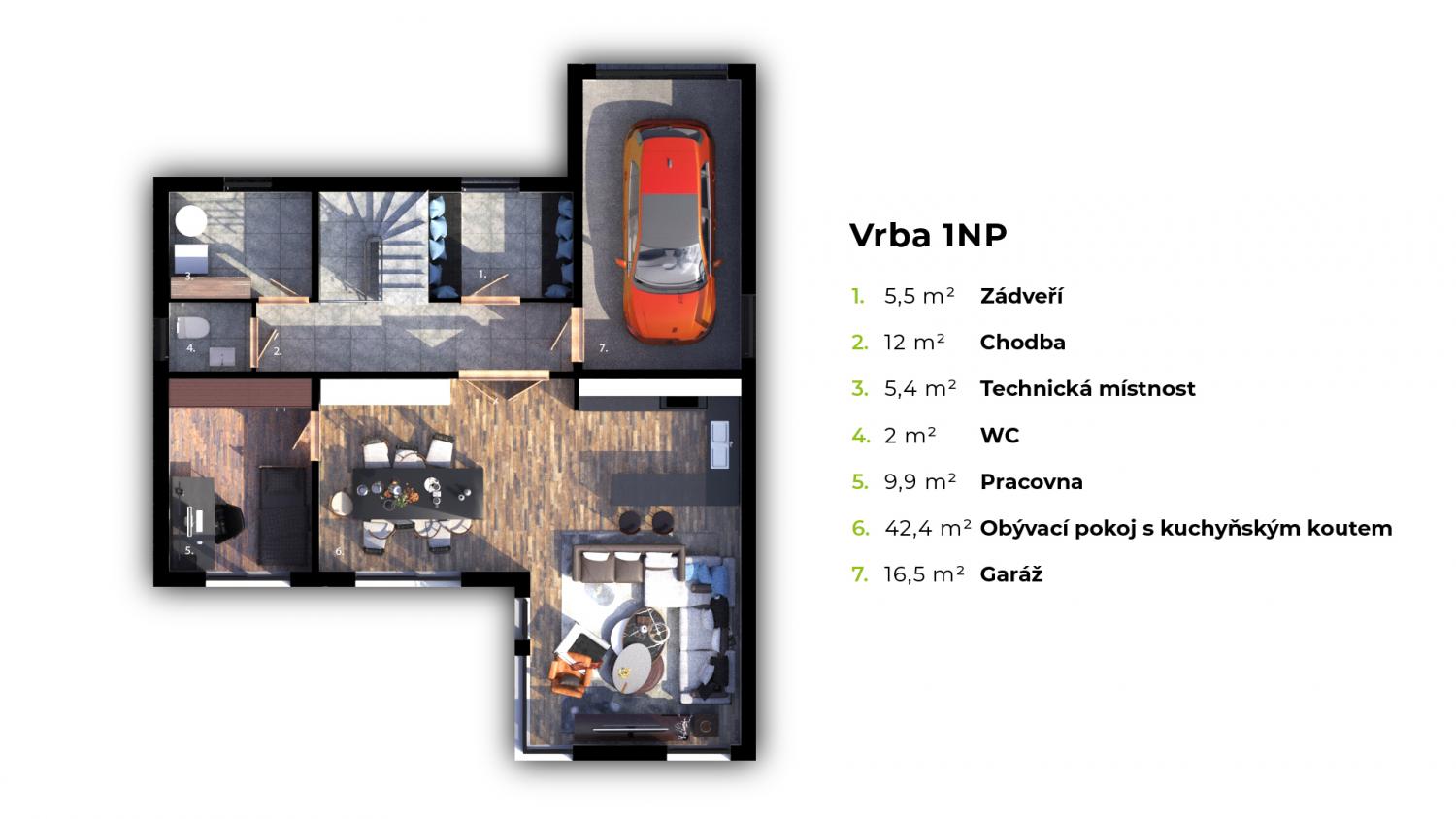 Patrový dům "Vrba" obsahuje obývací pokoj s prakticky řešeným kuchyňským koutem, pracovnu, v patře pak ložnici s vlastní šatnou a koupelnou, dva dětské pokoje a menší pokoj/pracovnu.